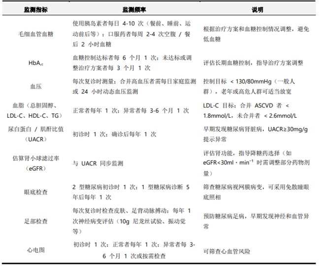 血糖监测:包括自我血糖监测(SMBG)、血浆血糖测定、持续葡萄糖监测(CGM),根据病情变化调整监测频次;