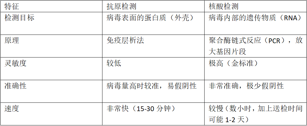病毒抗原检测:像测新冠抗原一样,用鼻拭子或咽拭子取样,15-30分钟就能出结果,非常快。它的优点是快速便捷,但在病毒量不高时可能“漏检”(假阴性)。