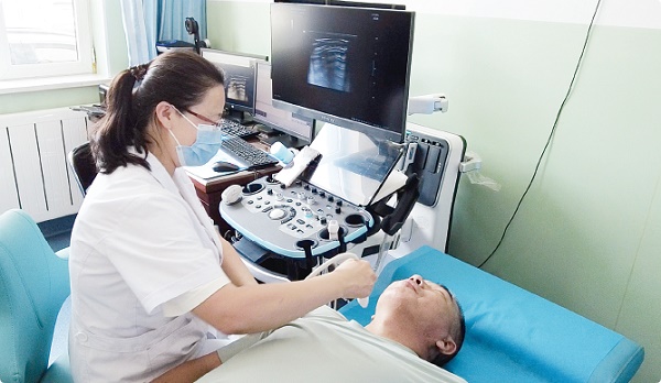 在内蒙古自治区鄂尔多斯市准格尔旗龙口镇中心卫生院内,该院张先芬主治医师在给一名就诊者做颈动脉B超检查。