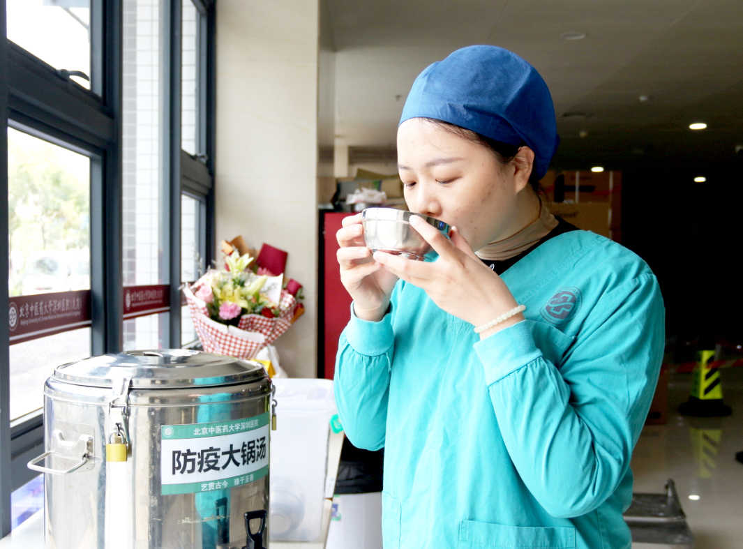 北京中医药大学深圳医院(龙岗)医护人员在饮用防疫大锅汤